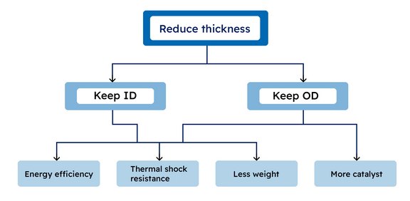 Wird der Außendurchmesser der Reformerrohre beibehalten, ermöglicht die höhere Zeitstandfestigkeit von Centralloy® G 4852 Micro R eine Absenkung der minimalen Wandstärke (MSW). Daraus ergeben sich mehrere Vorteile: